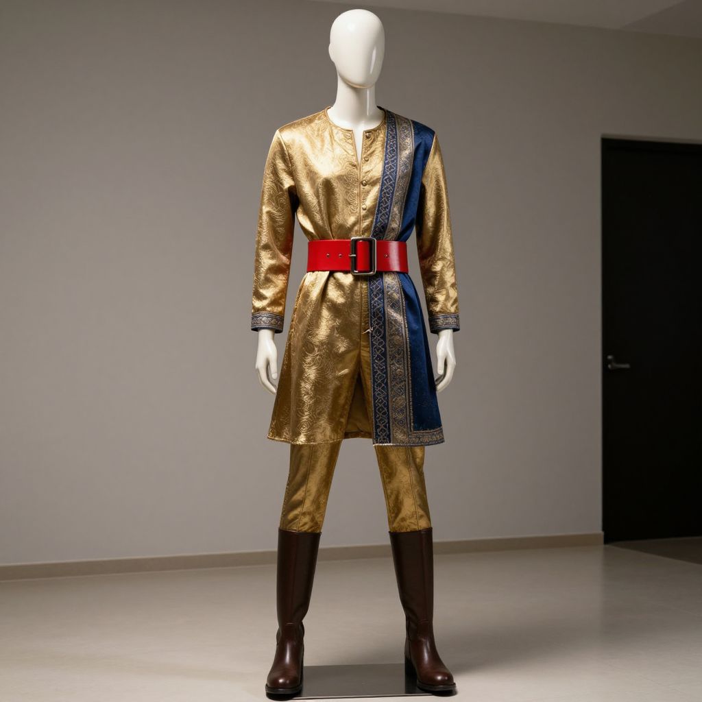 Photograph of a white mannequin wearing a gold, long-sleeved tunic with intricate blue and silver embroidery on the left side. The tunic is belted with a wide, vibrant red belt at the waist. The mannequin also wears dark brown, knee-high boots. The background is a simple, gray, minimalist room with a dark door on the right. The mannequin's face is featureless, focusing attention on the detailed and colorful attire. The texture of the tunic appears shiny and metallic. The overall style is reminiscent of historical or ethnic costume design.