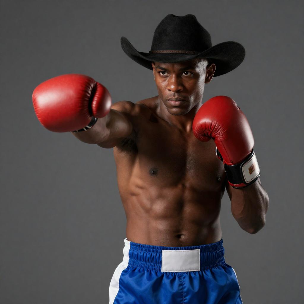 Muscular dark-skinned male boxer wearing red boxing gloves, a black cowboy hat, and blue athletic shorts, posing with a focused punch against a plain gray background.