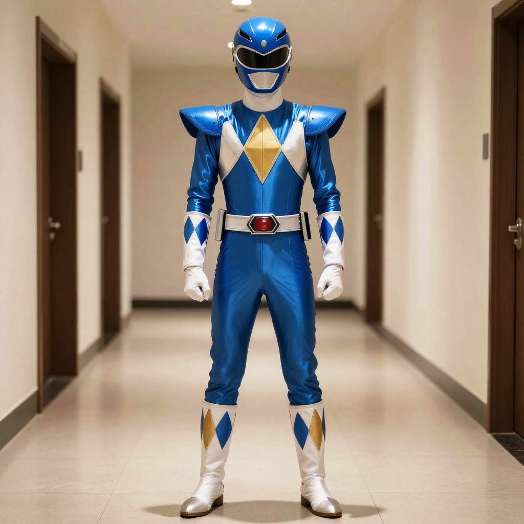 Blue Ranger Adult, dressed in blue and gold standing in a hallway