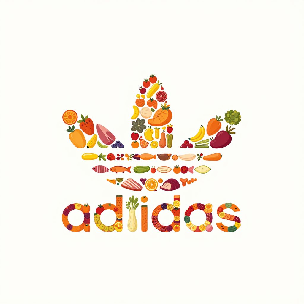 Two-Dimensional addidas logo made of fruits, vegetables, meat, fish :: Symmetrical, clean, planar, minimal XD, monogram logos, elegant, simple,
