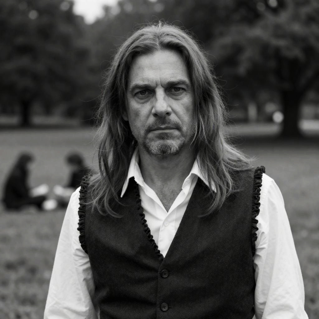Black-and-white photograph of a middle-aged man with long, disheveled hair, facial stubble, and intense expression. He wears a dark, frilled vest over a white shirt. Background includes trees, grassy field, and two blurred figures sitting.