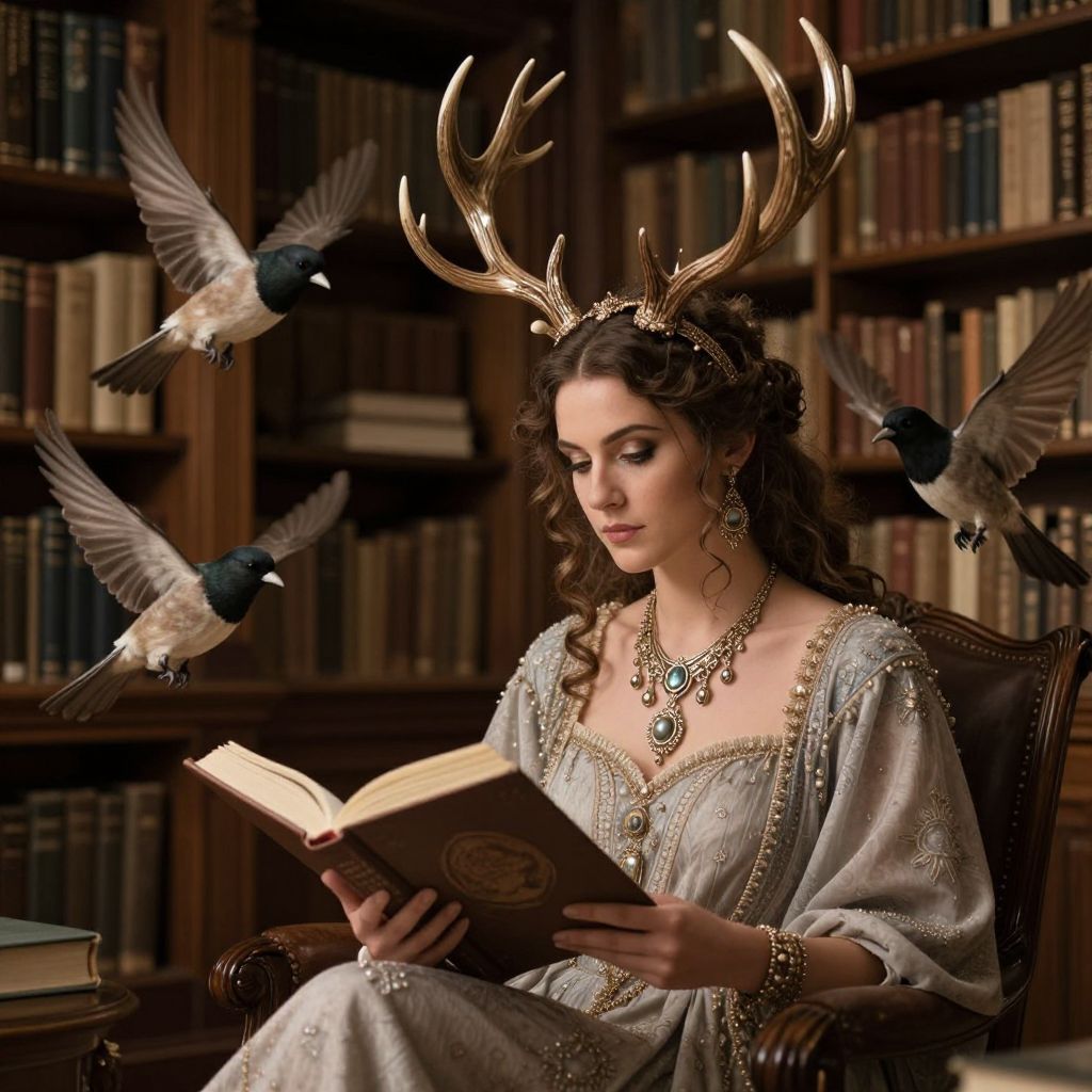 Seated in a cozy library, a woman adorned with majestic antlers and elegant jewelry reads an open book, as three birds gracefully flutter around her, blending the ethereal with the scholarly ambiance.