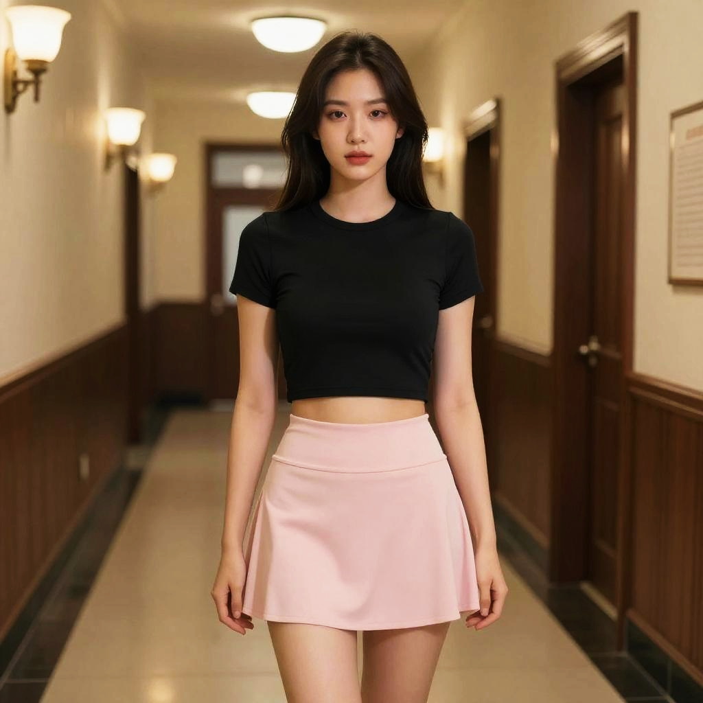 Photograph of an Asian woman with long, straight black hair standing in a dimly lit, narrow hallway with wooden wainscoting and warm overhead lighting. She wears a fitted black crop top and a short, pale pink skirt. Her expression is neutral, with soft makeup accentuating her features. The hallway has closed wooden doors on both sides, with a wall-mounted light fixture visible on the left. The floor is tiled in a glossy, beige material. Her posture is straight, and she stands centered in the frame.