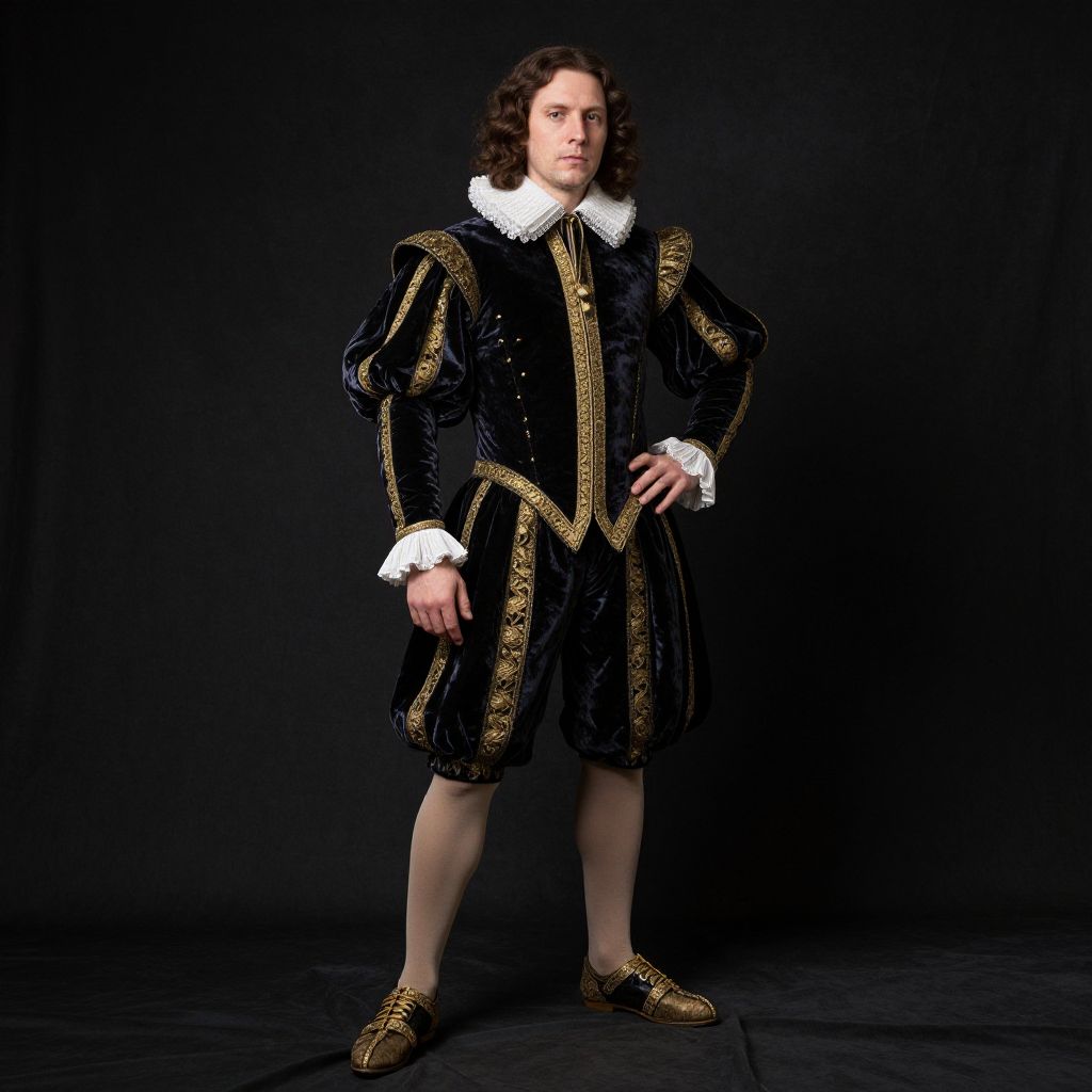 A man dressed in an elaborate Renaissance-style velvet outfit poses confidently against a dark fabric backdrop. His attire features detailed gold trim, a ruffled collar, and matching shoes, evoking the elegance and grandeur of 16th-century European nobility.
