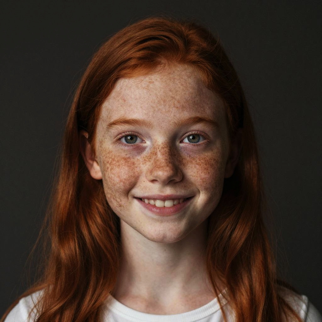 Photograph of a smiling young girl with long red hair, freckles, and blue eyes, wearing a white shirt, against a dark background.