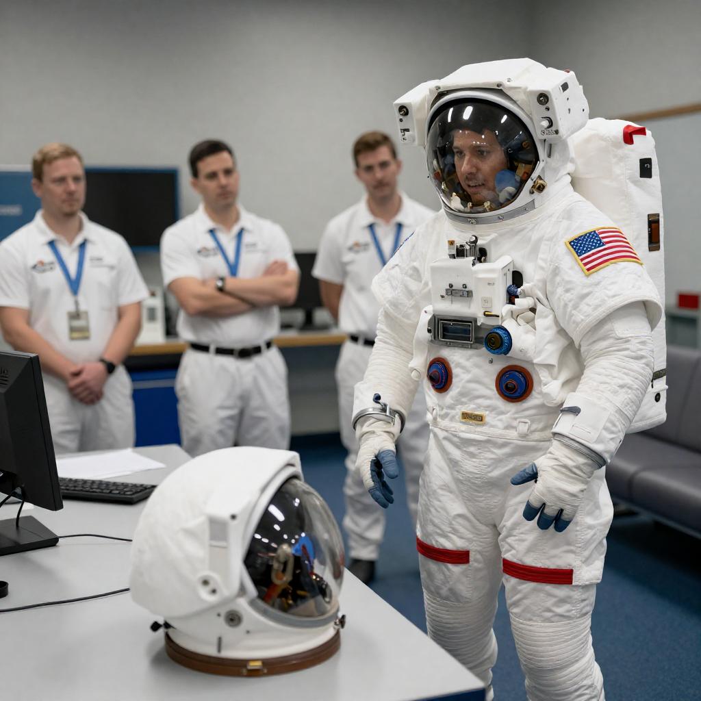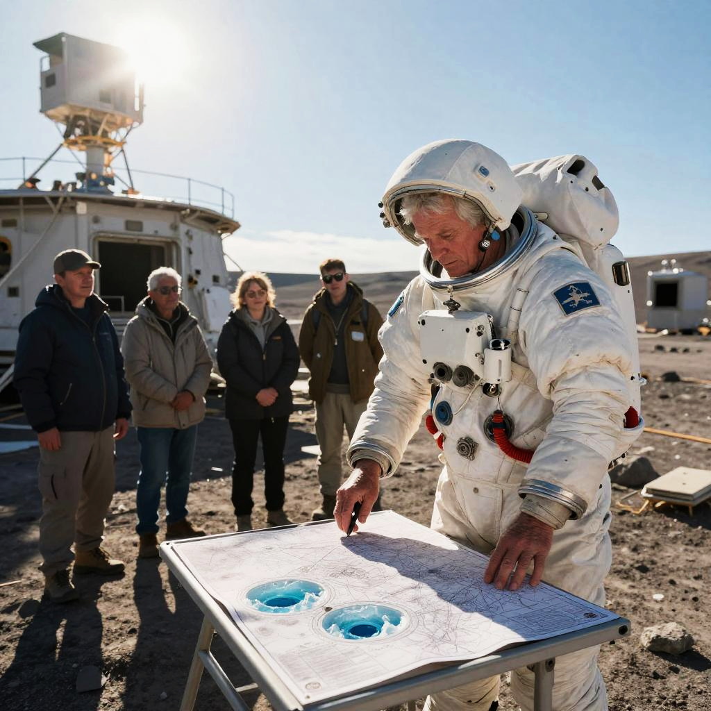 In the heart of abandoned lunar colony, a retired geologist reveals mapping the hidden ice deposits to curious onlookers, as the sun casts a warm glow over the vibrant scene.