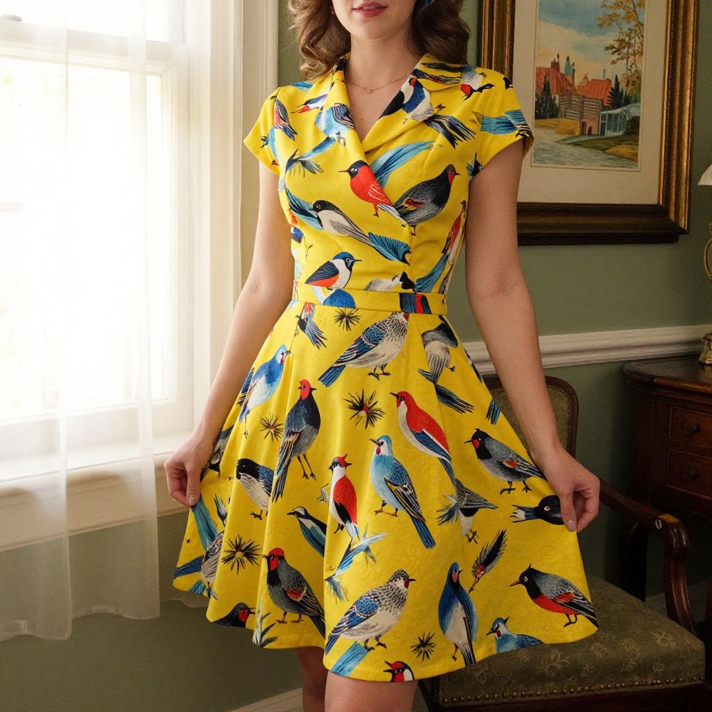 Woman wearing a vintage 1940s-style two-piece playsuit adorned with a vibrant bird print, standing indoors near a window with soft natural light streaming through, complemented by a cozy interior featuring framed artwork and classic furnishings.