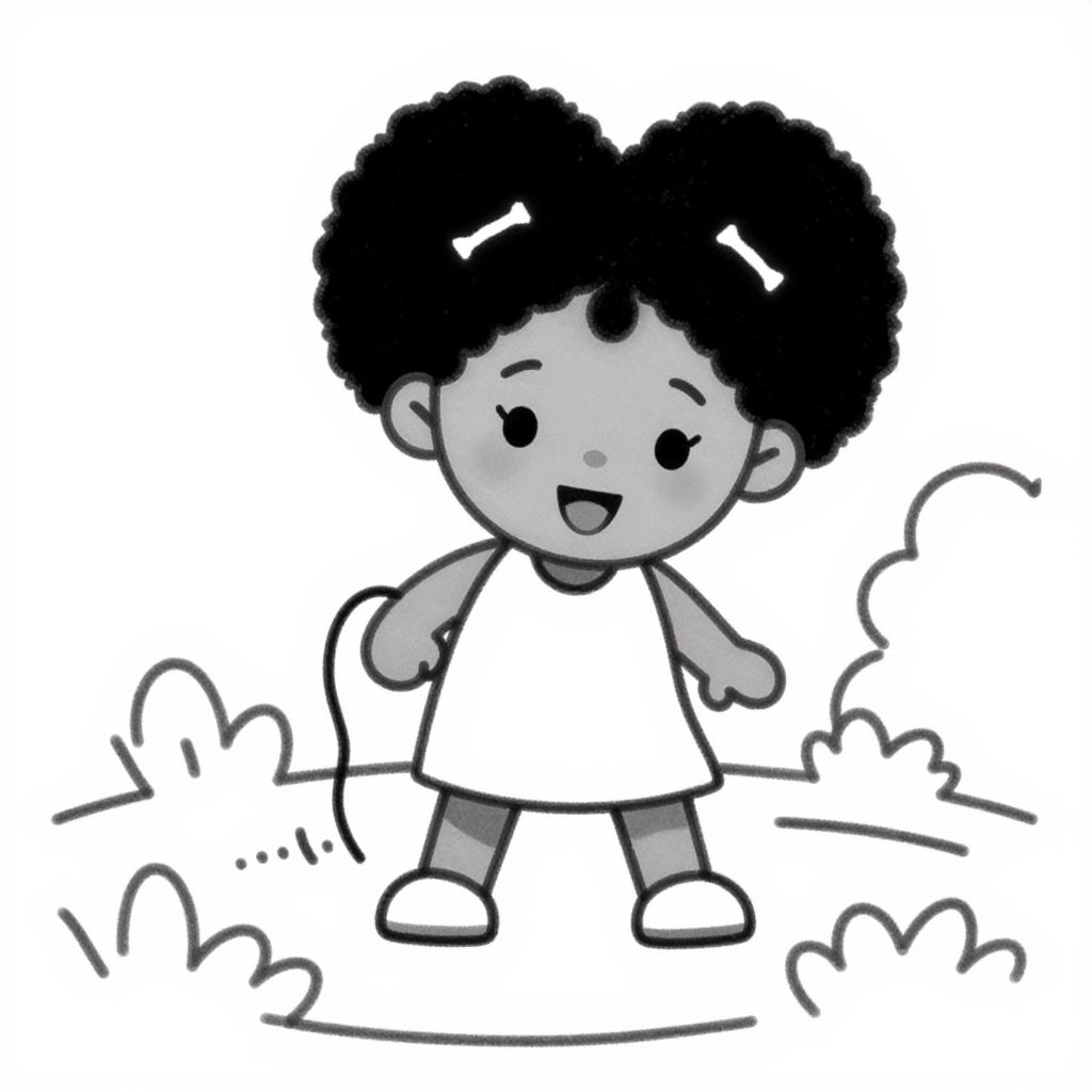 This is a digital cartoon drawing of a young Black girl with dark, curly hair styled in two puffs, each adorned with a white hairclip. She has a light gray complexion and is smiling with her mouth open. She wears a simple white dress and white shoes. Her arms are slightly raised, and she stands on a grassy patch outlined by simple, black, bush-like shapes. The background is white, emphasizing the character. The style is simple and childlike, with bold, black outlines and minimal shading. The overall feel is cheerful and playful.