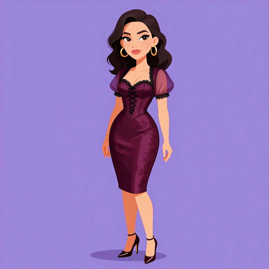 Illustration of a woman with a pretty face and long dark wavy hair wearing a deep burgundy satin corset-inspired sheath dress with a structured bodice, lace-up back detail, pencil skirt silhouette, and delicate floral embroidery. She also has a matching sheer organza bolero jacket with black lace trim. The outfit is complemented by patent leather stilettos with ankle straps and gold accents. The woman wears large gold hoop earrings and has a confident posture against a plain purple background.
