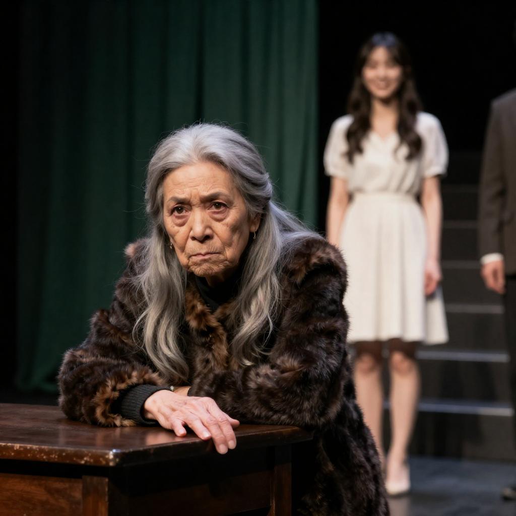 Two people on stage, woman in purple, layered, ruffled dress sitting on bench, man with gray beard, white hair, brown coat, leaning forward, reaching out. Background: colorful mural of buildings, trees, lampposts. Man's intense gaze, woman's calm expression.