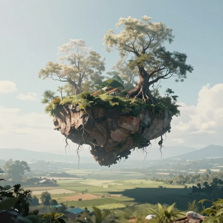 Digital artwork of a floating island with tall trees and lush greenery, suspended above a rural landscape with fields and houses.