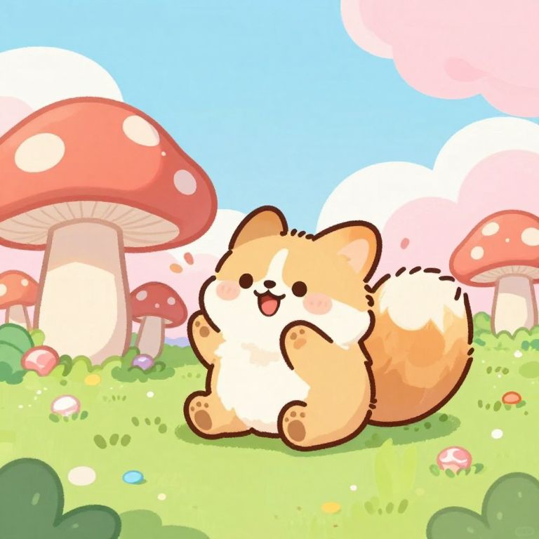 Cute:cyegtugci-k= playful furry character with a big fluffy tail and expressive eyes, sitting on a candy-like landscape with oversized mushrooms and pastel clouds, exhibiting a joyful and magical aura, illustrated in a charming storybook style