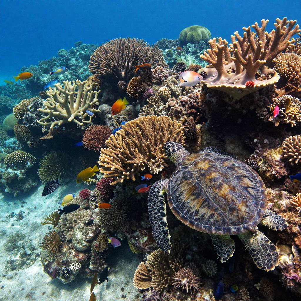Realistic form of a vibrant coral reef underwater scene, intricate coral textures, diverse marine life including fish and sea turtles, clear blue water with sunlight beams penetrating, ultra detailed and natural.