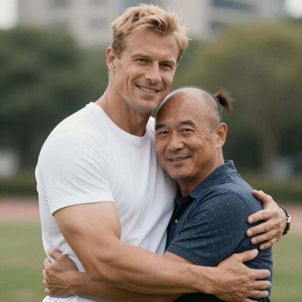 Photograph of two middle-aged men hugging outdoors. Taller man with short blond hair, muscular build, white t-shirt, smiling. Shorter man with balding head, dark hair in a ponytail, patterned blue shirt, smiling. Green, blurry background with trees and buildings. Taller man's left arm around shorter man's back, shorter man's right arm around taller man's waist.