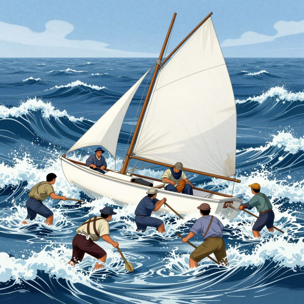 Colorful digital illustration of seven men in blue and beige clothes struggling to stay on a small white sailboat in turbulent blue ocean waves under a clear sky