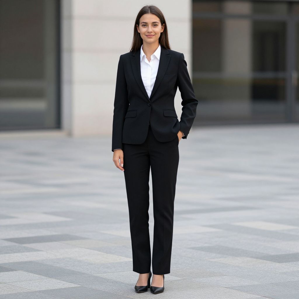 Photograph of a confident, slender woman with long brown hair, wearing a black suit, white shirt, and black shoes, standing on a modern urban