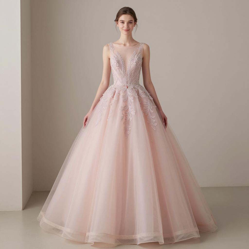Tulle party dress woman, photorealistic portrait of a young woman, standing, wearing a strapless navy blue lace dress with a voluminous tulle skirt, brown hair in an elegant updo, wearing dangling silver earrings, background with floral arrangements, soft lighting, elegant and sophisticated atmosphere, focused on the subject, detailed ures in lace and tulle, woman looking directly at the camera, neutral makeup, slightly smiling, upscale and refined setting, model-like appearance