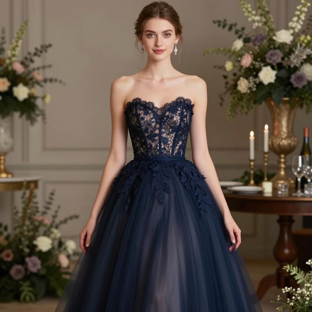 Photorealistic portrait of a young woman with brown hair styled in an elegant updo, wearing a strapless navy blue dress featuring intricate lace details on the bodice and a voluminous tulle skirt. She accessorizes with dangling silver earrings and subtle neutral makeup. The setting is an upscale, refined indoor space decorated with floral arrangements, candlelight, and soft lighting, creating a sophisticated atmosphere. The woman faces the camera with a slight smile, embodying grace and elegance.