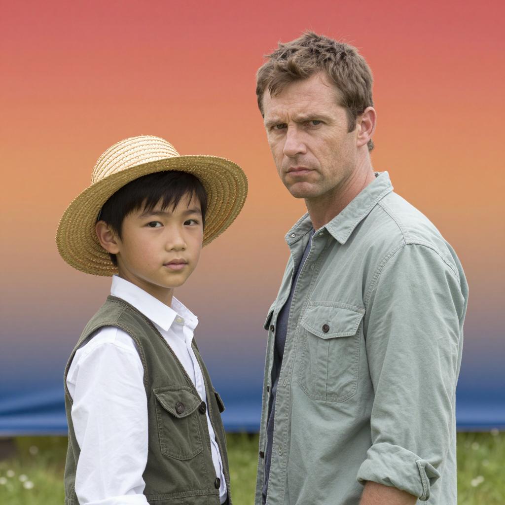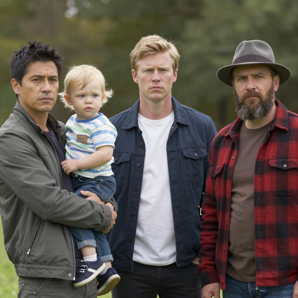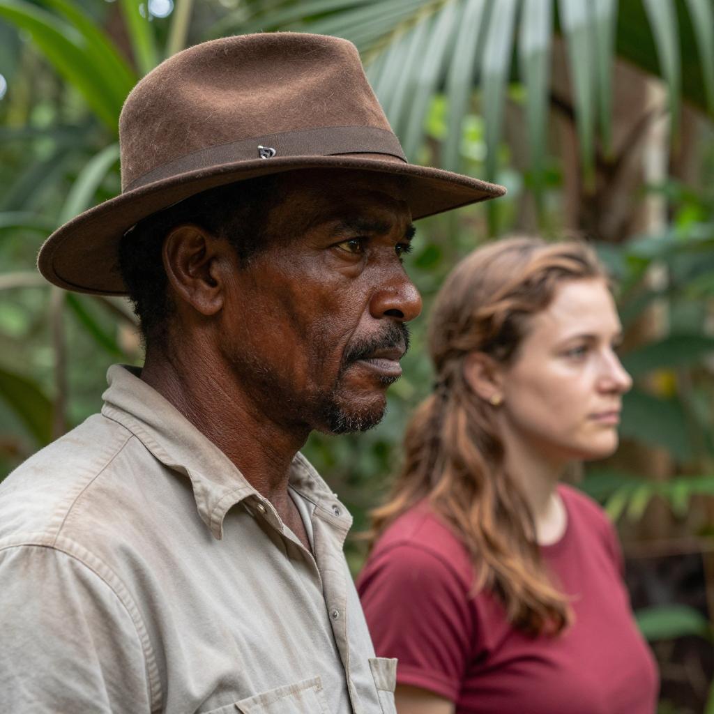 Four people walking through dense green foliage. Man in center wears blue shirt, beige pants, brown hat, brown belt. Woman with blonde hair, red shirt, beige shorts walks to his right. Girl in purple sleeveless top, blue cap, blue jeans on left. Boy on right wears light blue shirt, brown vest, holds book, brown hair. All look forward, serious expressions. Man's hands in pockets, woman's hands in front. Tropical plants and trees in background. Bright, natural light.
