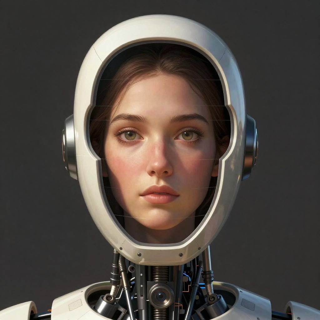 Illustration of a female scientist head with wearing protective goggles and gentle expression, tight bun with loose wisps, lab coat with digital circuit patterns. Highly detailed, in the style of Hayao Miyazaki and Leonardo da Vinci, centered, 6K, character concept, digital art