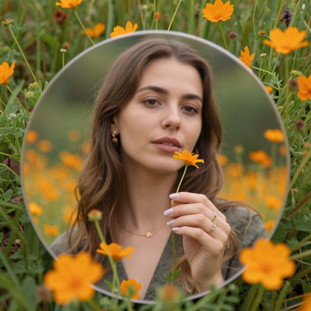 Woman standing amidst a vibrant field of orange wildflowers, framed by a circular mirror that captures her serene expression as she gently holds a delicate flower stem with her right hand, adorned with a ring and polished nails.