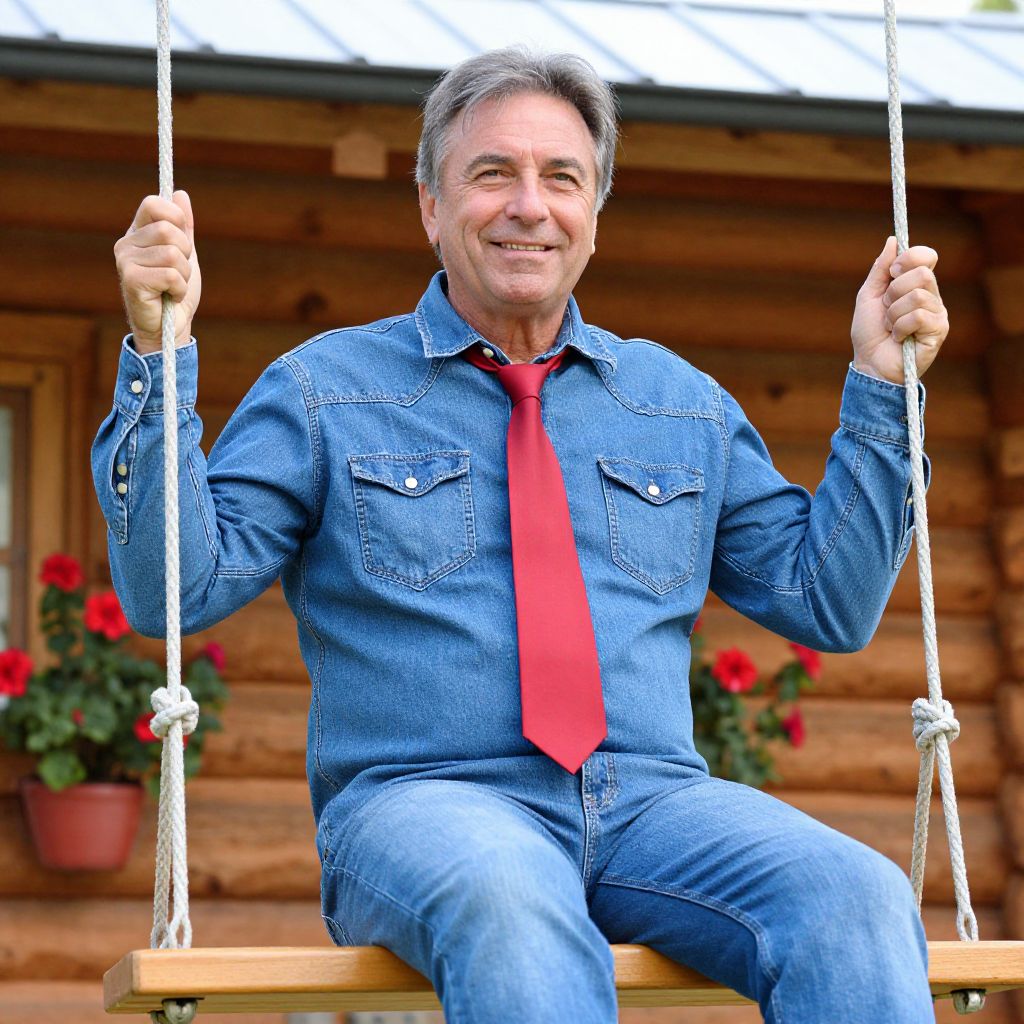 Middle-aged man with gray hair, wearing blue denim shirt and red tie, sitting on wooden swing in front of rustic log cabin with red potted flowers