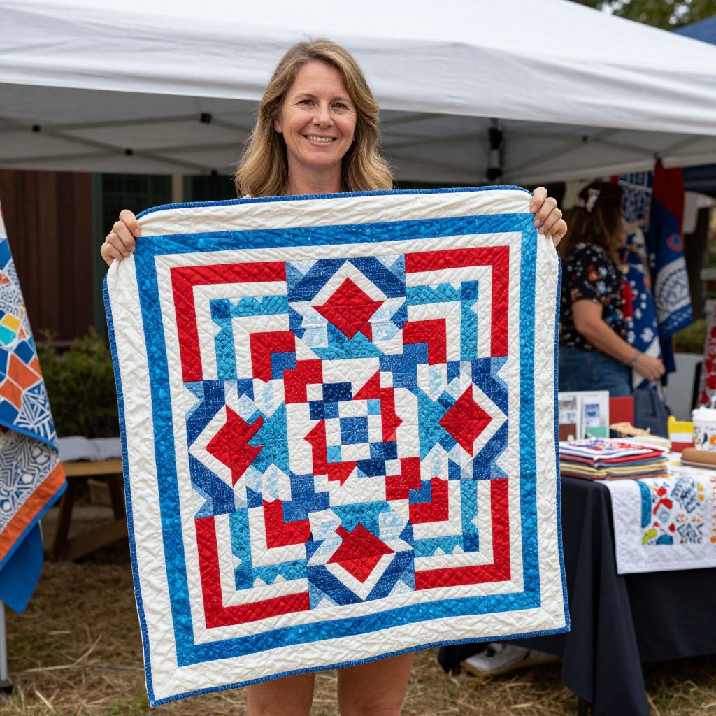 Woman Displaying Vibrant Geometric Quilt