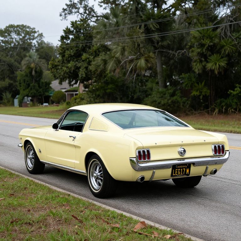Vintage 1965 Ford Mustang Fastback 2+2, painted in creamy pale yellow, is parked along a quiet roadside in Jackson, MS, showcasing its classic design with dual rear taillights, chrome bumper, and California license plate reading \"LEG17 M.\