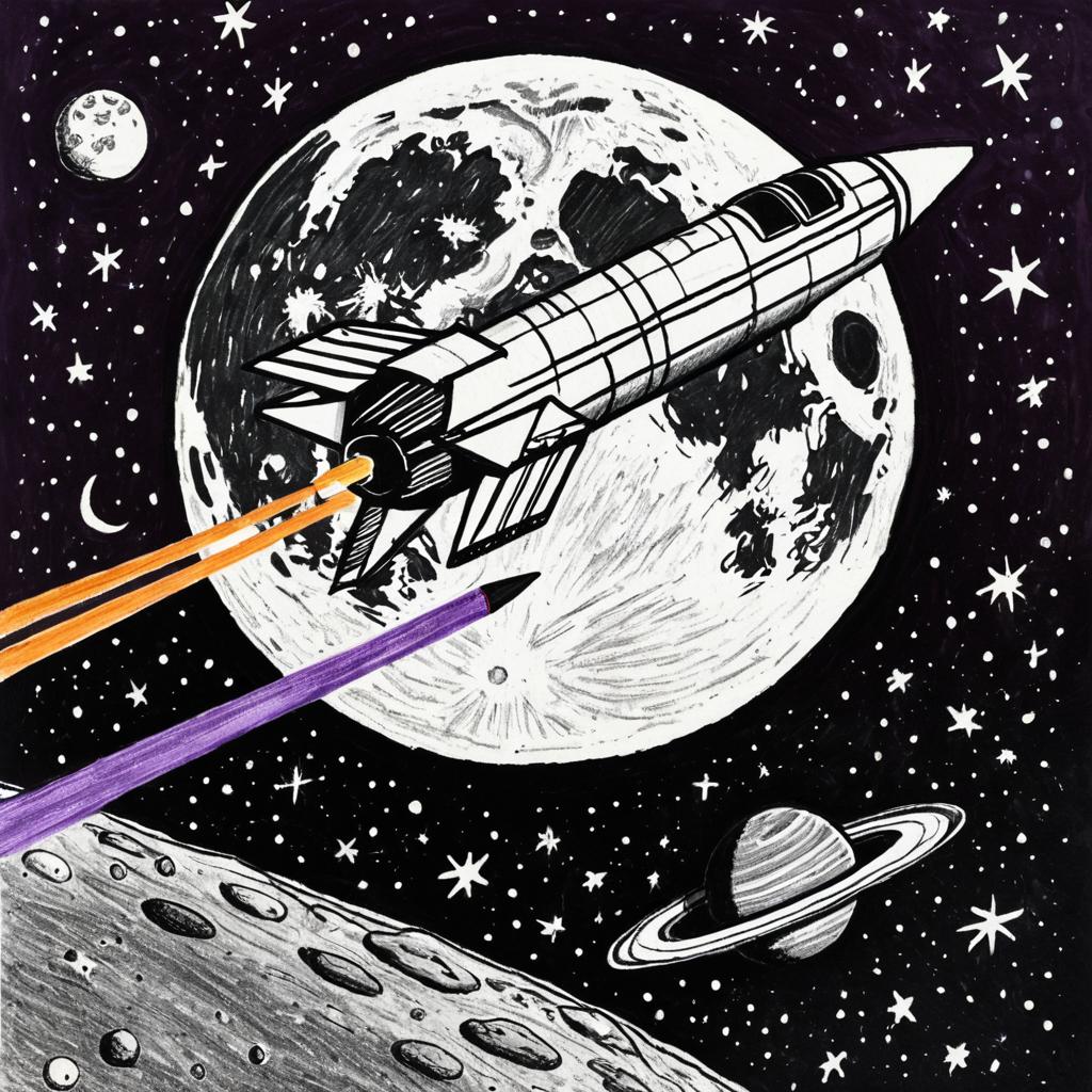 Wistful a kids art project drawing on regular sized paper of a grey rocket ship in space leaving earth below, flying past the moon, planet saturn with rings in distant top left corner, dark purple starry sky, outlined in black medium marker and colored with crayola crayons,