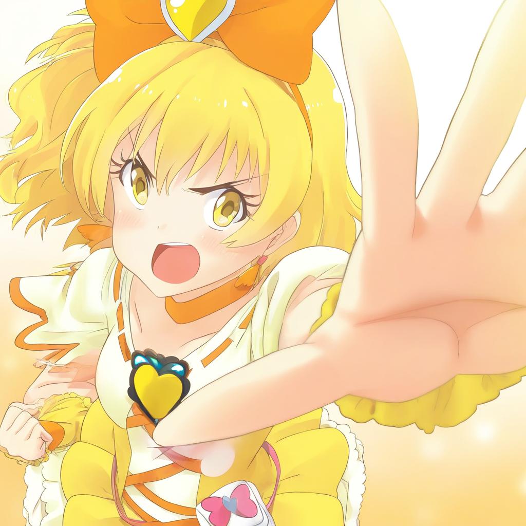 Cure pine, precure, 1girl, yellow eyes, brown eyes, short hair, blonde hair, heart hair ornament, hair bow, orange choker, earrings, magical girl, one side up, magical girl, wrist cuffs, by artist twin (tt lsh), leet