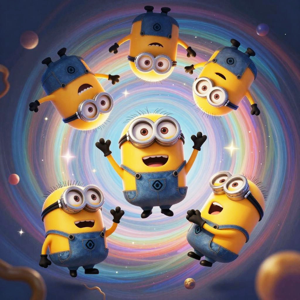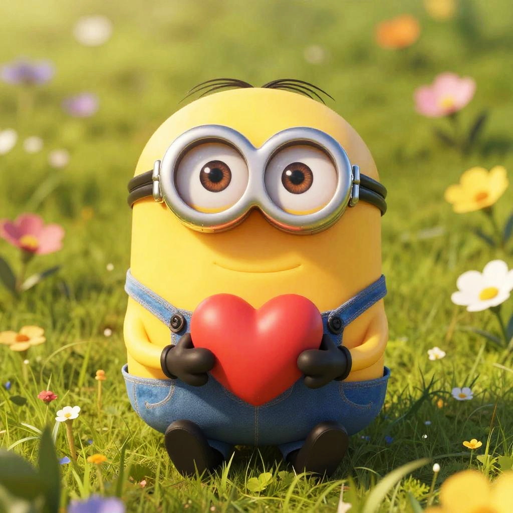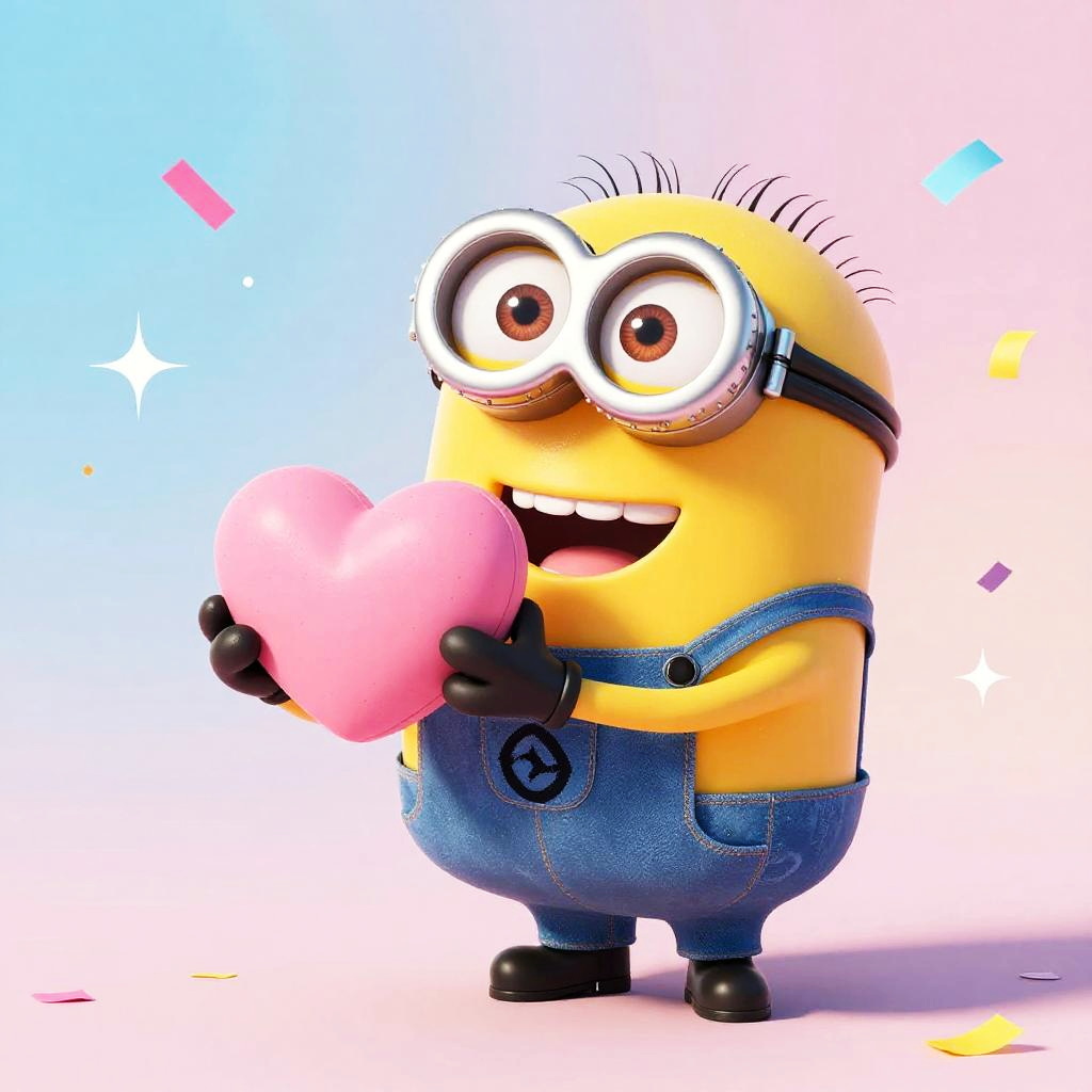 Minion holding a heart, cheerful animated character smiling warmly while holding a large, sparkling heart, colorful background with floating hearts and rays of sunshine, joyful and heartwarming scene