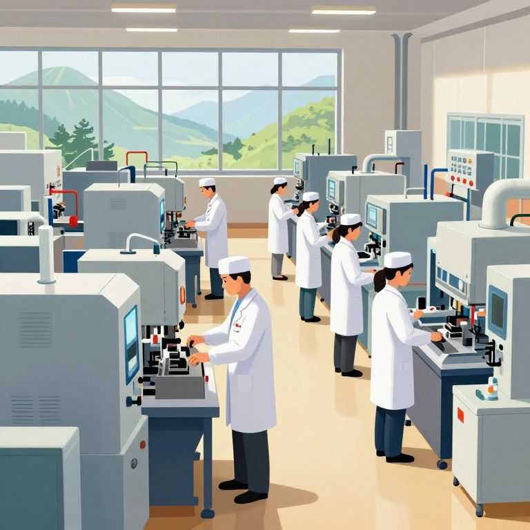 In this 3D illustration, employees are diligently working in a modern Chinese factory, surrounded by an array of industrial equipment and machinery. The scene is set in a spacious, well-lit facility with a large window revealing a picturesque mountainous landscape in the background. The employees, dressed in white lab coats and hats, are focused on their tasks, with one individual examining a large, intricate machine, while others stand nearby, observing or assisting. The factory floor is equipped with various machines, pipes, and control panels, indicating a high-tech manufacturing environment. The overall composition is balanced, with the employees positioned centrally, and the machinery and equipment arranged symmetrically, creating a sense of order and efficiency. The interplay of colors, from the cool tones of the machinery to the warm hues of the employees' clothing, adds depth and realism to the scene, capturing the essence of a 21st-century industrial workplace.