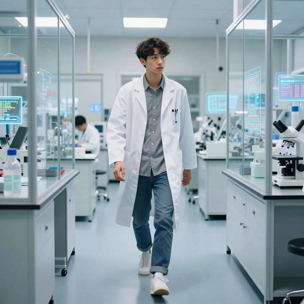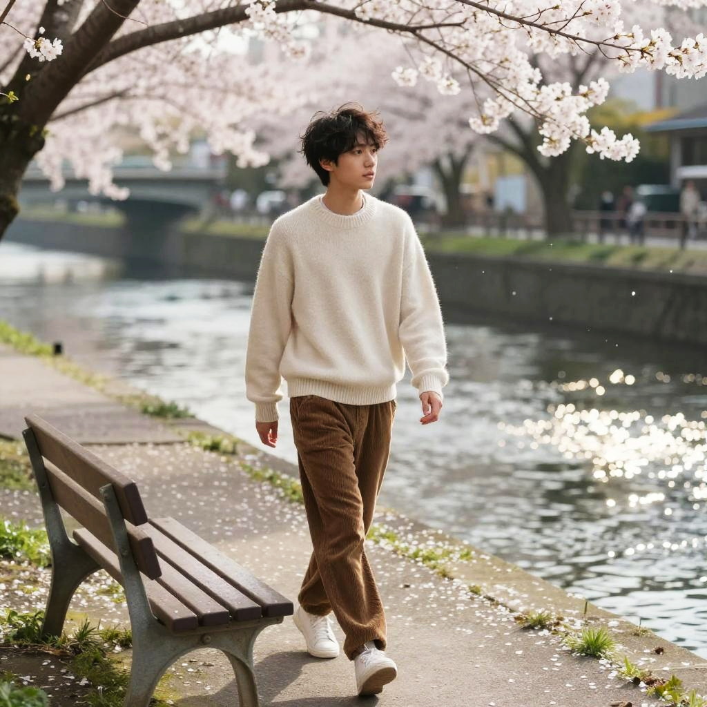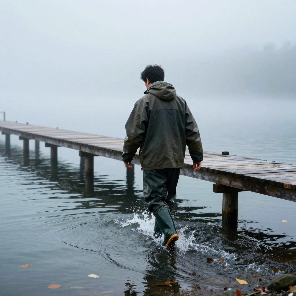 A lone fisherman, wearing a waterproof jacket and rubber boots, walking through a misty lakeside pier, surrounded by calm water ripples and floating leaves, drawn in the dreamy and reflective style of Naji Yanagida.