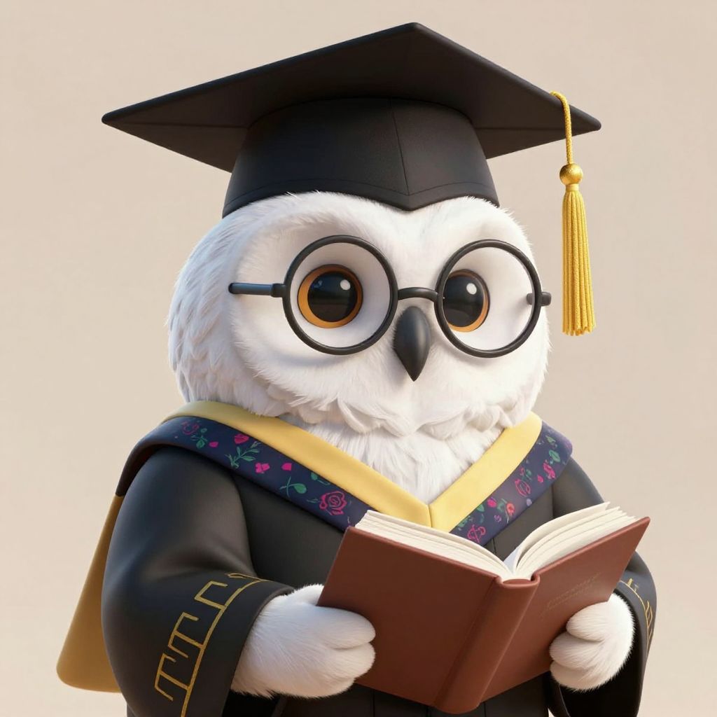Realistic animated rabbit dressed in a graduation cap and gown, wearing round glasses. The rabbit holds a small book and stands in front of a classic academic building with a clock tower. The character expresses wisdom and dignity with soft lifelike fur textures and a scholarly appearance.