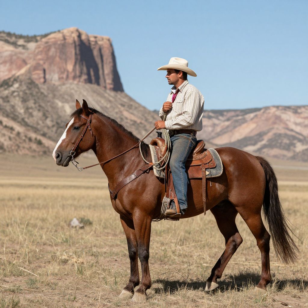 Texan man in traditional Western attire, riding a majestic brown stallion across an open prairie, with a backdrop of towering mesas and expansive blue skies, capturing the spirit of the Old West and cowboy lifestyle with a weathered leather saddle and a lasso in hand.