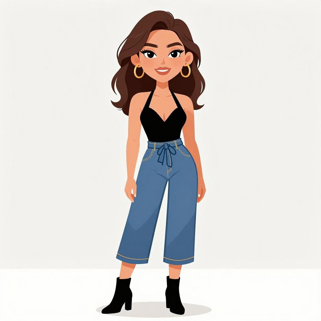 Woman with pretty face and pretty hair. smiling Woman, bohemian chic, deep purple crop top, scoop neck, thin straps, black pleated maxi skirt, high-waisted, flowing silhouette, beige platform sandals with thick straps, white studio background. --sref 1467
