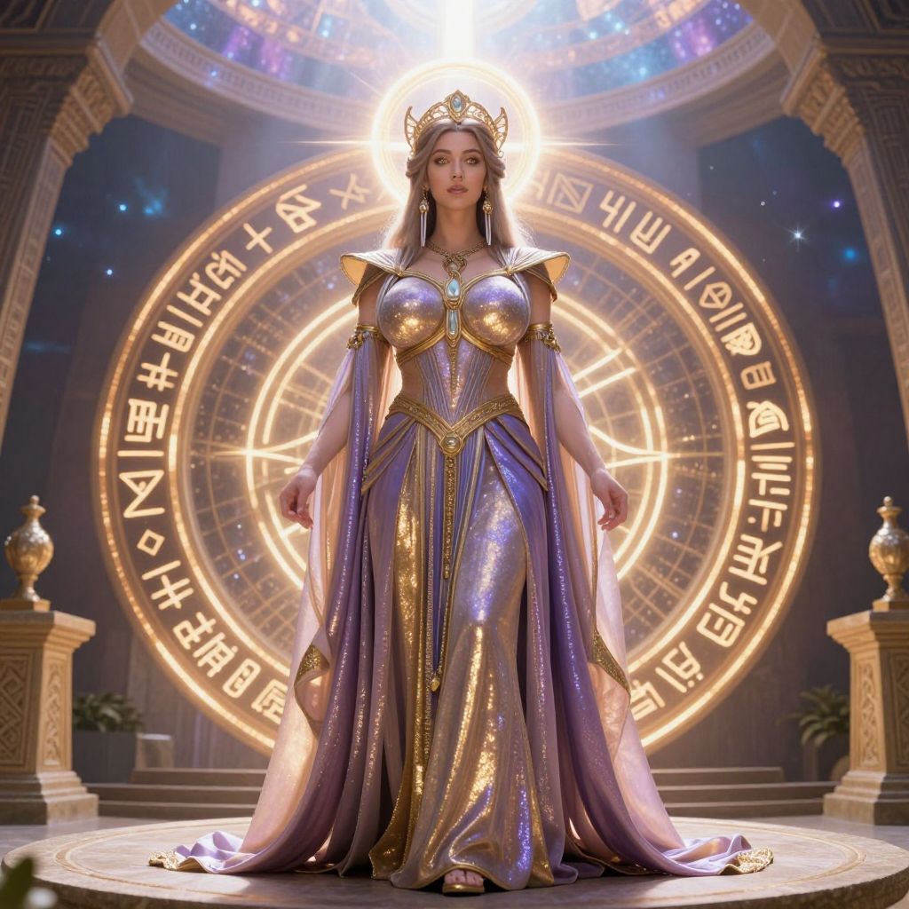 Photorealistic CGI image of a regal woman with long, straight brown hair, wearing a golden crown, and an elaborate, shimmering purple and gold gown with long sleeves and a flowing train. She stands confidently in front of a large, glowing, circular zodiac wheel with Hebrew letters, set against a dark, ornate backdrop with arches and pillars. Her gown reflects light, highlighting its metallic texture. The background is illuminated with soft, ethereal light, enhancing the mystical, celestial theme. She has a fair complexion and a composed expression.