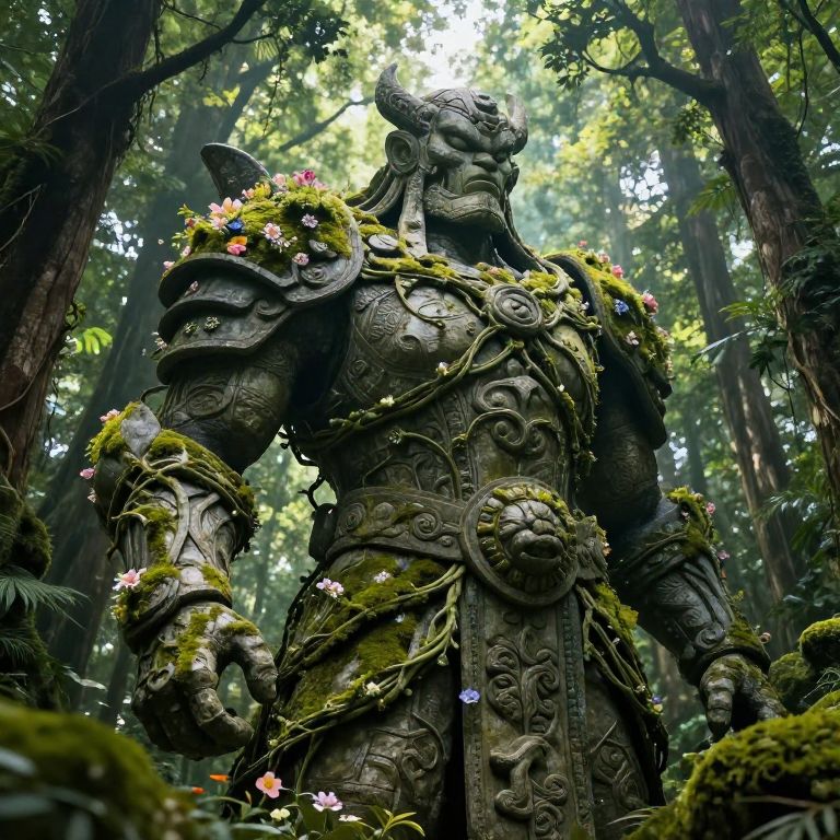 Colossus towering over an ancient cityscape at sunset, giant stone figure covered in moss and vines, intricate engravings glowing faintly, dramatic lighting highlighting its massive scale, cinematic wide shot, fantasy art style.
