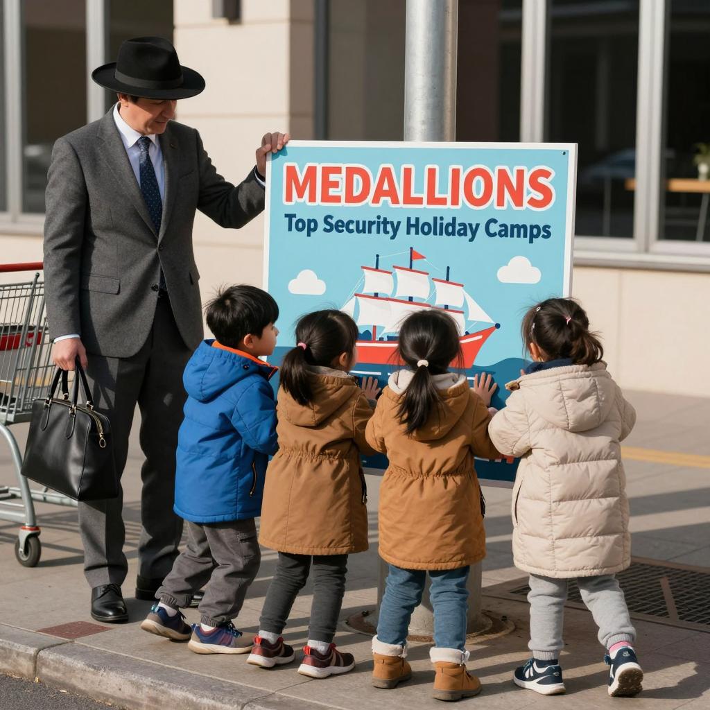 A street scene. Man in gray suit, black hat, white shirt, and tie stands to the left, holding a bag. Four children in front of him push against a large, colorful poster. Children wear winter clothes, including a blue jacket, brown coat, and beige puffer jacket. Background includes a shopping cart, building with vertical windows, and a metal post. Poster reads "MEDALLIONS Top Security Holiday Camps" with an image of a ship. Bright sunlight casts shadows on the ground.