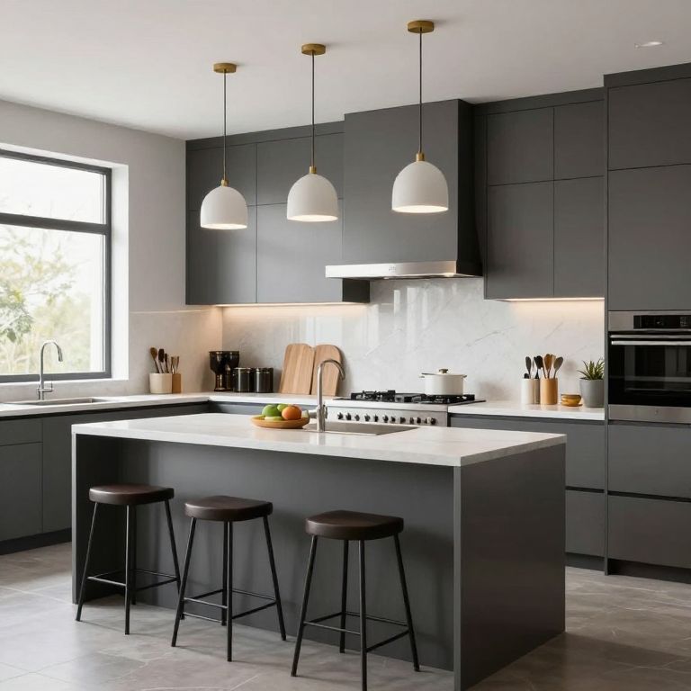 Modern kitchen photograph with dark gray cabinets, white marble island, three black stools, three white pendant lights, and a bright window.