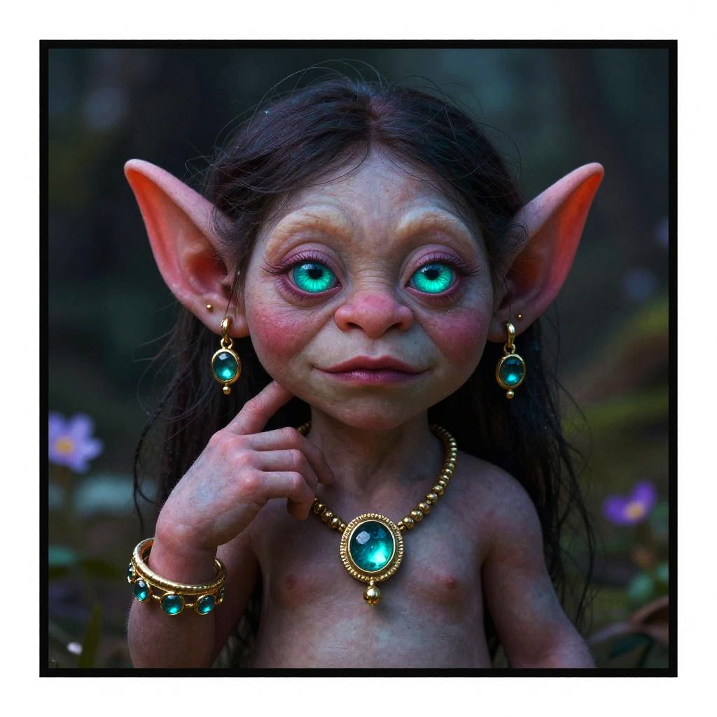 Concept art f/1.4, square image, close up film photo, portrait of a Troll, neon wild, cyan eyes, knick knack jewelry, elegant pose, atmospheric lighting, cinematic composition, detailed, spring, mood, Horror . digital artwork, illustrative, painterly, matte painting, highly detailed