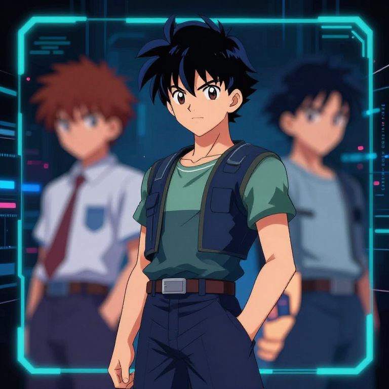 This digital anime-style drawing features a focused, black-haired teenage boy with large, expressive brown eyes in the foreground. He wears a green t-shirt, black cargo vest, and black pants with a brown belt. His hands rest in his pockets. The background is blurred, showing two other teenage boys with brown spiky hair and blue spiky hair, respectively. The blurred boys wear white shirts with ties and blue shirts. The backdrop includes neon blue lines and futuristic digital elements, suggesting a sci-fi setting. The image has a vibrant, colorful aesthetic with sharp contrasts and a dynamic, energetic feel.