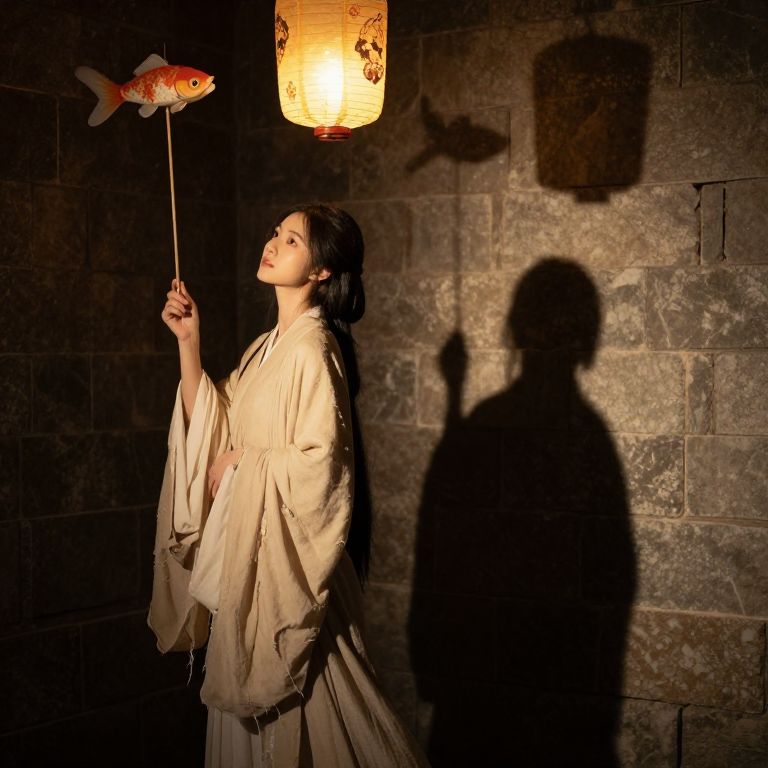 Photograph of a young woman with pale skin and dark hair in a traditional Japanese kimono, illuminated by an orange paper lantern featuring a goldfish design. She gazes upward while holding a fish-shaped paper lantern. The textured, stone wall background is dark, casting her shadow prominently on the right. The warm light from the lantern creates a soft glow on her face and kimono. The image has a mysterious, historical ambiance, with the lantern's light highlighting her serene expression.