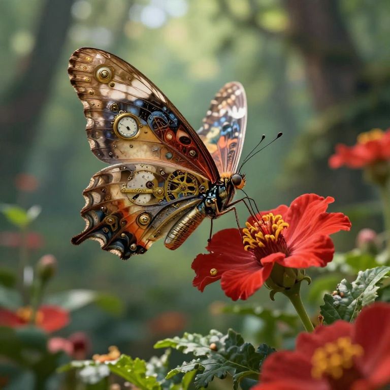 Craft an enchanting image in a vibrant surreal style, capturing a scene where a majestic dragonfly gracefully perches on the delicate petals of a giant rose. The dragonfly's iridescent wings shimmer with mesmerizing hues as it rests against the deep red velvet background of the flower. This unique perspective, resembling a close-up view from within the garden itself, evokes an enchanting atmosphere that harmoniously blends natural beauty with fantastical elements, inviting the viewer to explore the emotional gradient of wonder and tranquility within this dreamlike setting.
