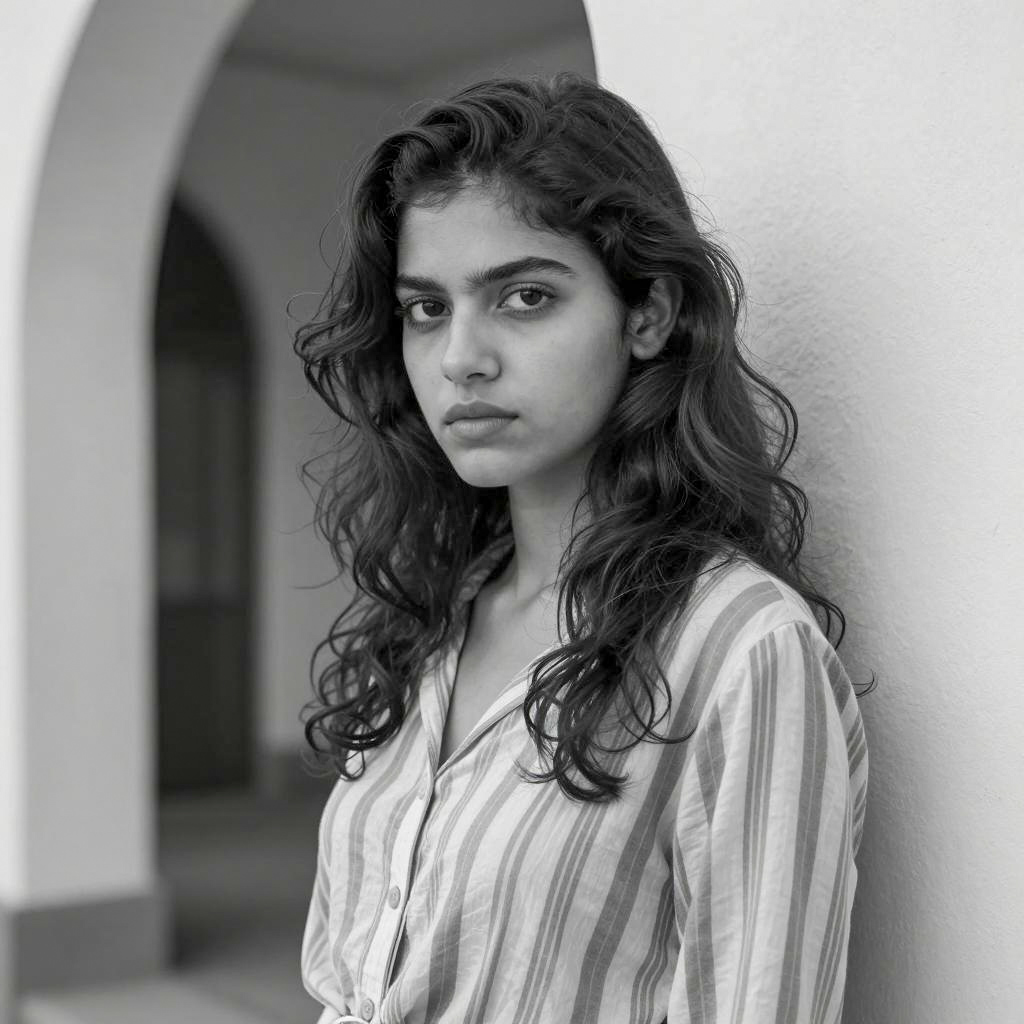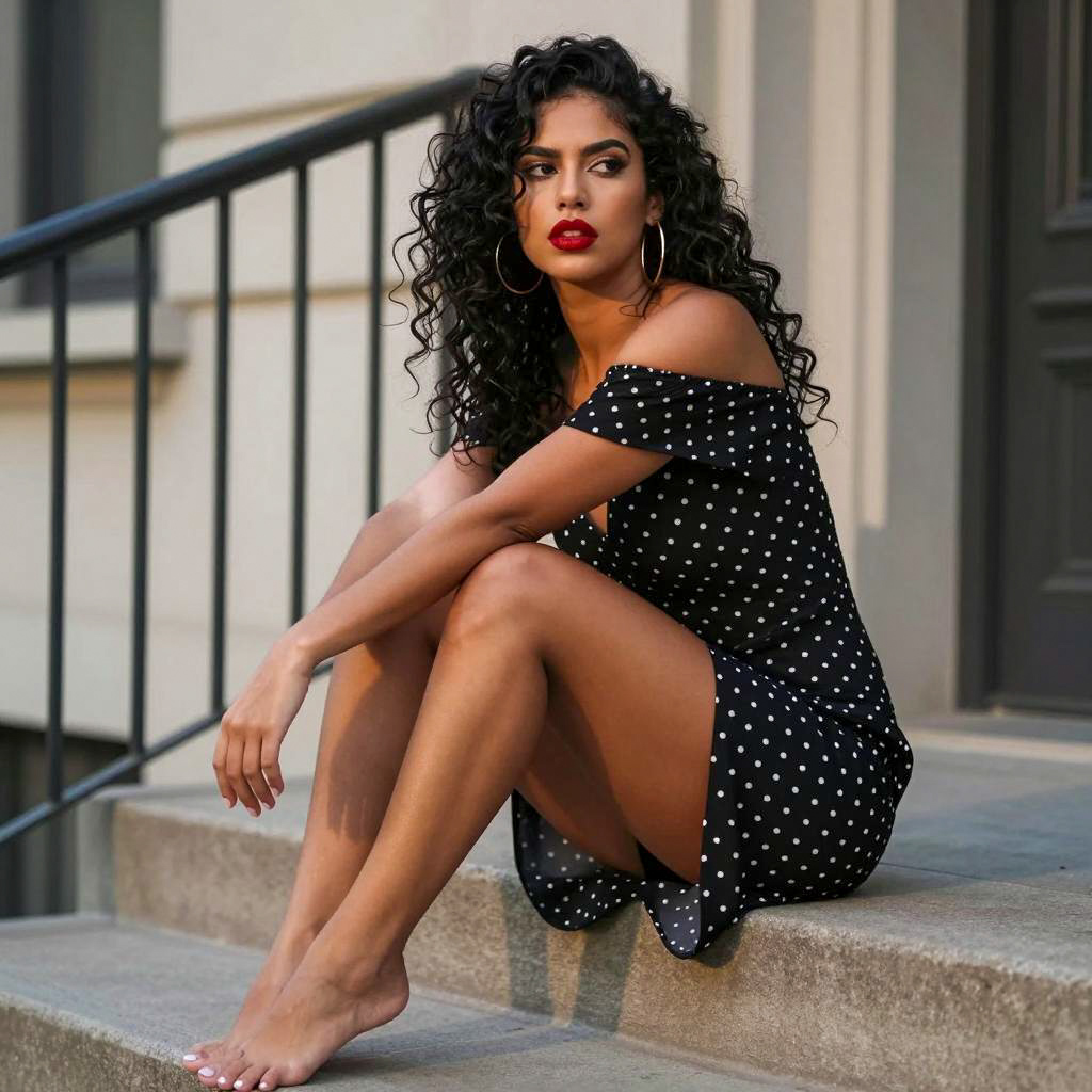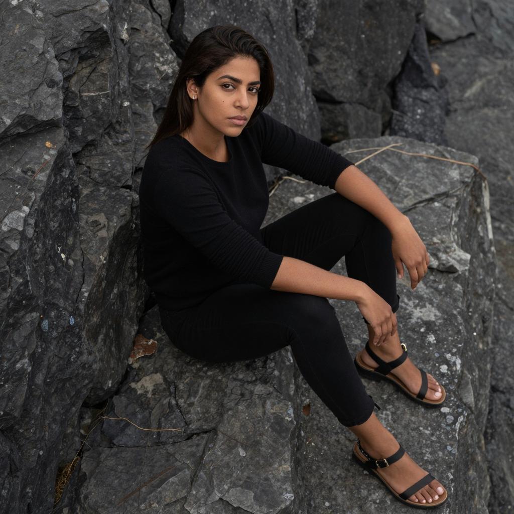 Woman with light brown skin and dark brown hair, wearing a black long-sleeve shirt and black pants, sitting on rough, dark gray rocks. She has black sandals on, right arm resting behind her, left arm on her knee, legs slightly apart. Her expression is neutral. Rock ure is rugged with visible cracks. Overhead angle.
