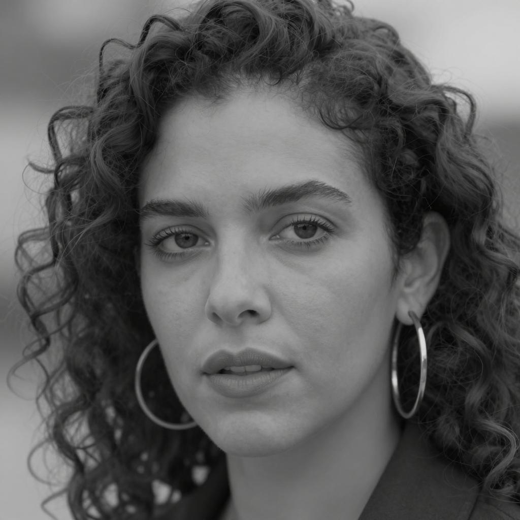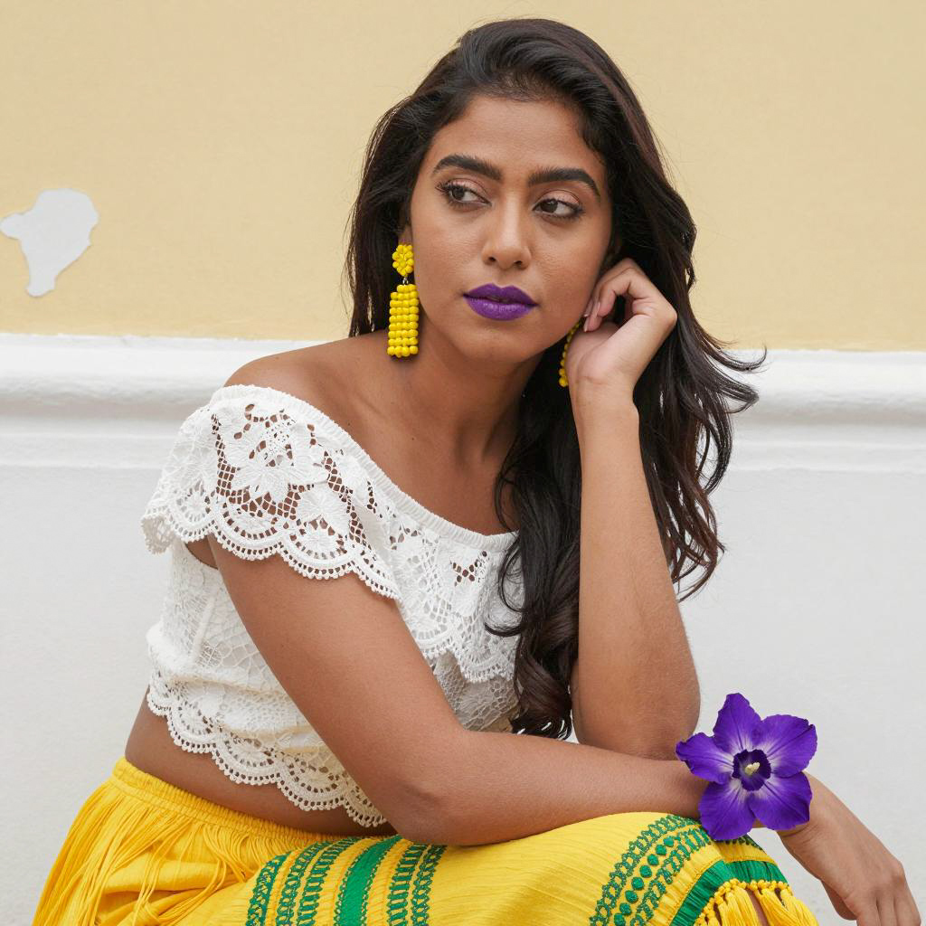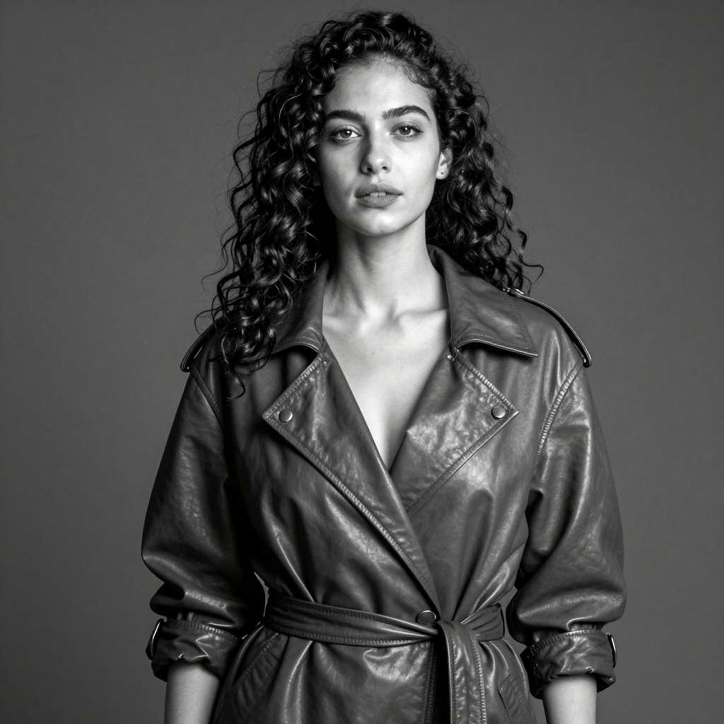 Woman with light brown skin and dark brown hair, wearing a black long-sleeve shirt and black pants, sitting on rough, dark gray rocks. She has black sandals on, right arm resting behind her, left arm on her knee, legs slightly apart. Her expression is neutral. Rock ure is rugged with visible cracks. Overhead angle.
