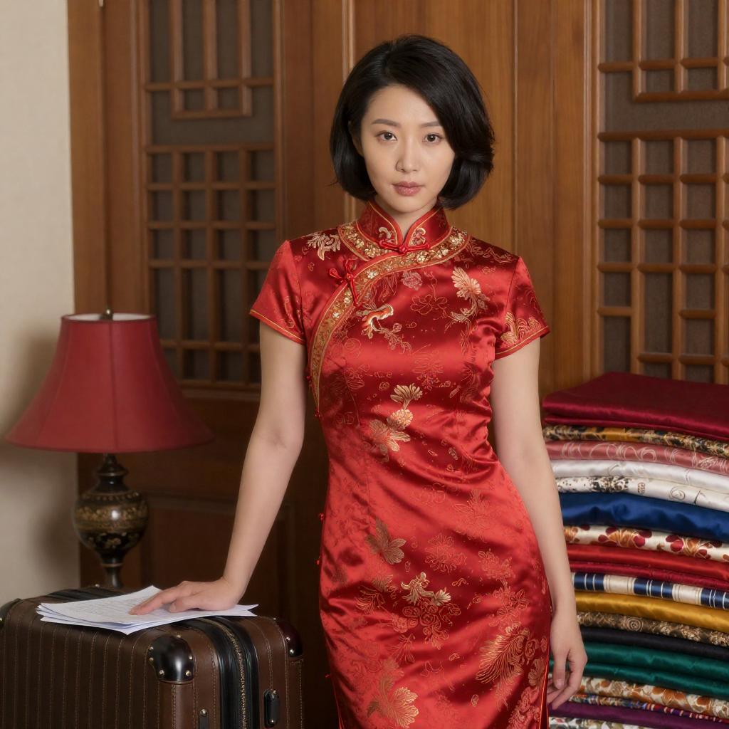 Asian woman with short black hair in a red and gold patterned traditional Chinese dress, standing in a room. She leans on a brown suitcase with papers, beside a red lamp and stacked fabric. Wood panel wall with lattice design in background. Neutral facial expression. Warm, indoor lighting. Stacks of fabric on right.