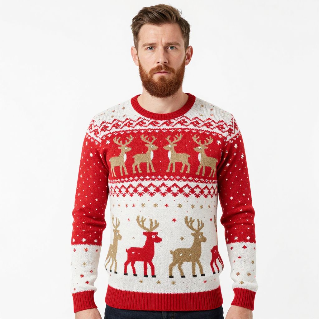 Photograph of a bearded white man with short brown hair, wearing a festive red and white Christmas sweater with reindeer and pine patterns. He stands against a plain white background, looking directly at the camera with a neutral expression. The sweater has red cuffs and a red hem, with a white body featuring red and gold reindeer designs.