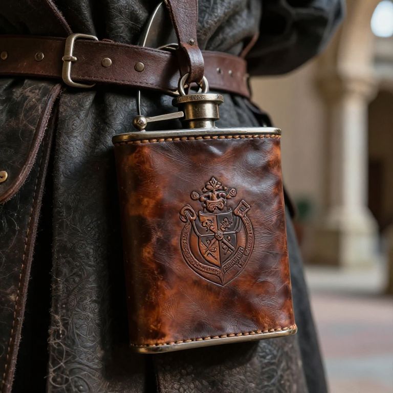 A worn medieval leather flask hanging from a knight’s belt, embossed with subtle heraldic symbols, sunlight filtering through a castle courtyard, realistic textures