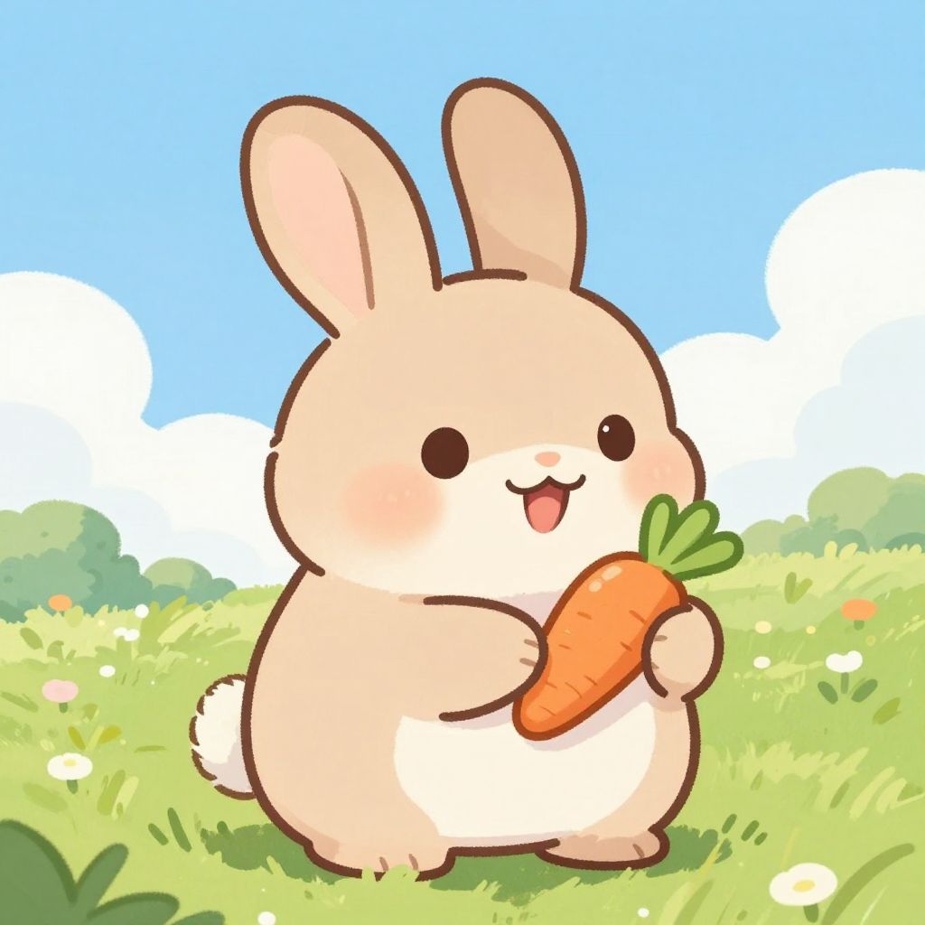 Furry cute art of an adorable chubby bunny with oversized ears and a playful smile, holding a tiny carrot in a cozy meadow under a bright blue sky, soft shading and warm tones, illustration inspired by storybook charm and innocence.